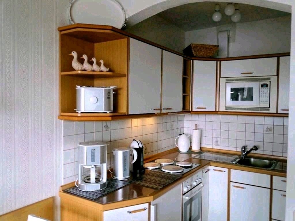 Küche: Kaffeemaschine, E-Herd, Backofen, Mikrowelle, Kühl- & Gefrierschrank, Toaster, Eierkocher, Geschirr und Töpfe