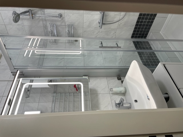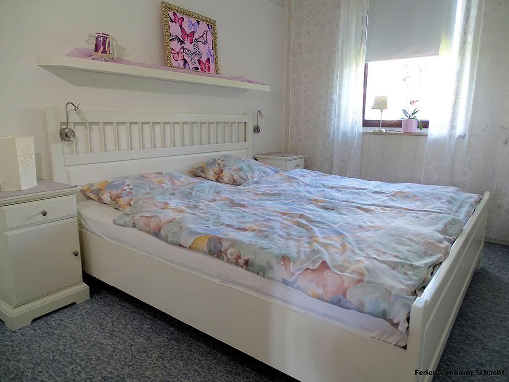 Es gibt ein Schlafzimmer mit einem Doppelbett (180x200), davon ist eine Bettseite mit einem elektrisch verstellbaren Lattenrost ausgestattet.