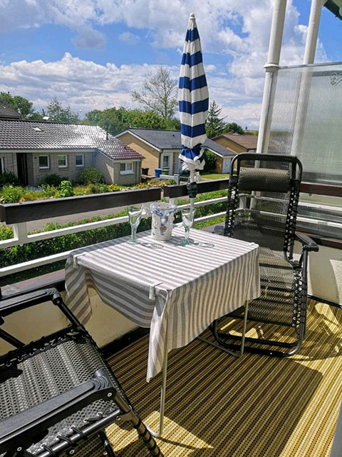 1 kostenloser PKW-Stellplatz, überdachter Südbalkon mit Deichblick mit zwei Relax-Stühlen, Auflagen, Tisch und Sonnenschirm
